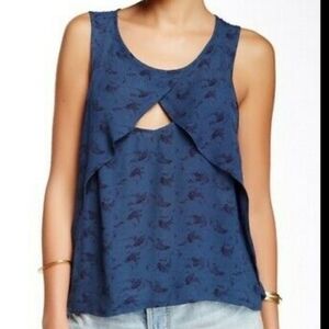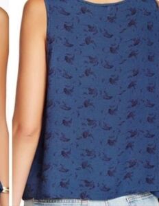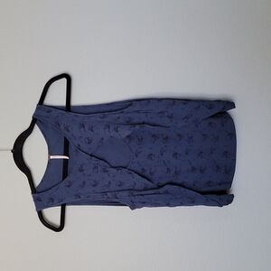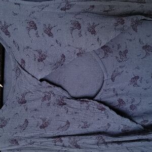 Minimally sheer fabric. Has a cut out at the chest. Has a layered look on the sides only. Dark blue with a black like print, I honestly can't make out what the print is supposed to be. Crinkle texture. Lightweight fabric. Minimal wash wear on fabric.
