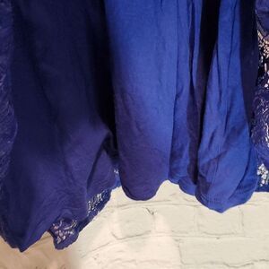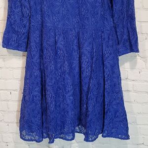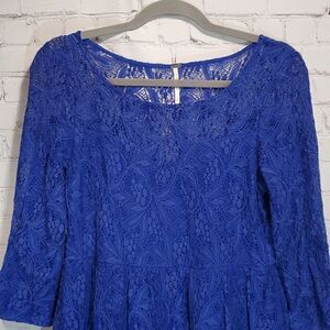 In excellent used condition no flaws. Soft blue lace with elbow length sleeves. Lined in the bottom and top with a more transparent back. Measures 16.5 inches armpit to armpit and 33.5 inches long.