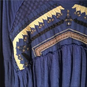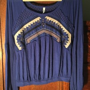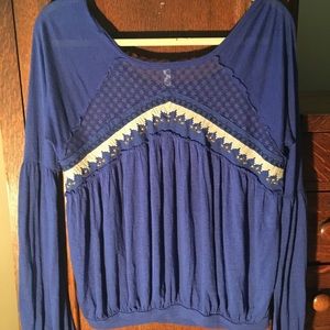 Like-new, Free People blue peasant top with intricate needlework. The neckline of this top sits wide across the shoulders and is very flattering. Size Small.
