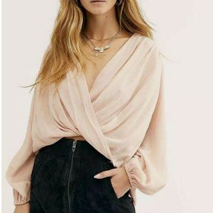 Free People blush faux wrap blouse L. Measurements: armpit to armpit 22 inches, shoulder to front hem 22 inches, shoulder to back hem 29 inches.