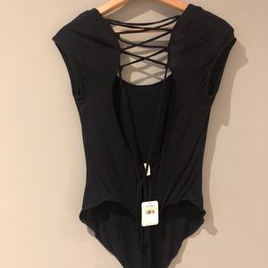 Thong snap closure. Scoop neck, cropped sleeves, lace up low cut back.