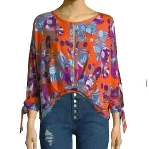 Free People boho style blouse, button front, oversized, XS X-Small. Bright orange floral blouse. In excellent pre-owned condition. No flaws. Measurements are approximate and taken flat.