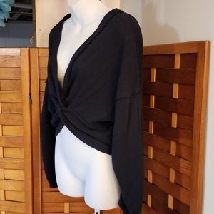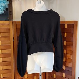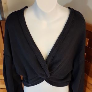 Free People brand top in a black cotton blend waffle texture material. open in the front Ballon style sleeves Very good pre owned condition. worn once. Aka ( I have a shopping problem Lol ๐) size med measurements are 18 inches across the chest and 24 inches in length from shoulder to hem.