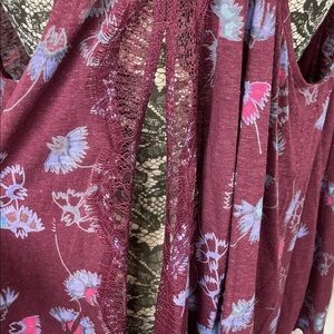 Free People swing top in a burgundy floral design. The top has a deep v in front and ties. The back is split open and edged in lace.