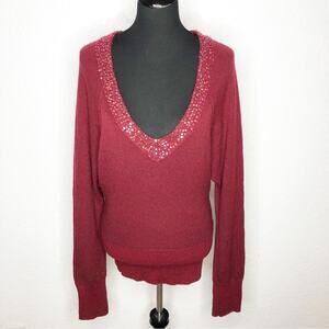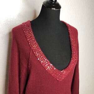 Free People burgundy sequin trim deep v neck wool blend sweater size Medium