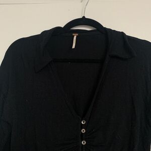 Collar, fitted through the waist and has buttons in front. Slight balloon sleeve (baggy through sleeve and fitted wrist). Very cute fit