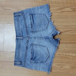 Free People shark bite denim cut off shorts. These shorts feature a hidden button fly, distressed raw hem, and lived-in feel. 5 pocket styling, light wash.