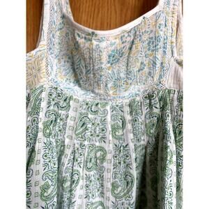 This pre-loved Free People camisole-style top is perfect for adding a dash of color to your warm-weather wardrobe. It is a size 6, features lace-up ties at the neckline, and is made of cotton. The top is 18" long, and the distance from armpit to armpit is 15". It features eye-catching green, blue, yellow, and white prints on the camisole top.