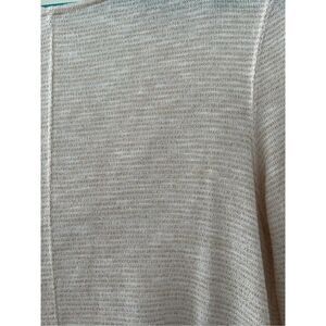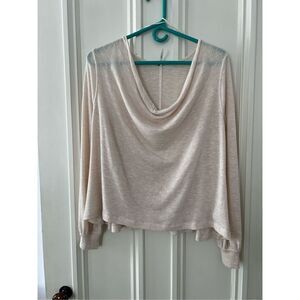 Free People polyester and rayon cream and gold striped tee, size small, long sleeve top, drop neck, length is approximately 21 inches in the front and approximately 24 inches in the back, sleeve length is approximately 25 inches, pit to pit is approximately 21 inches, Can be dressed up or dow, good condition- slightly oversized, peasant sleeves
