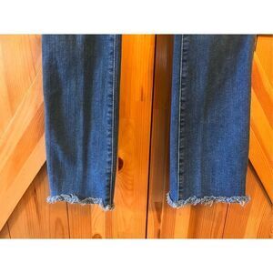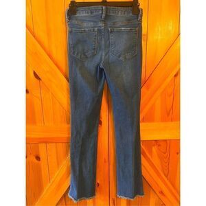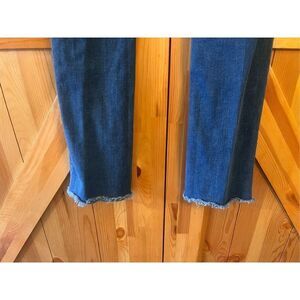 Distressed, blue pockets, Bootcut, raw hem stretchy  measurements 25x29” 8.5” rise (1665)