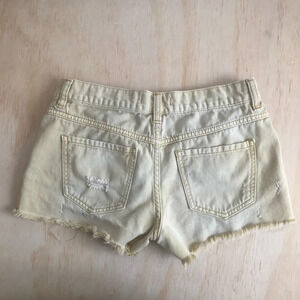 Free People tan yellow distressed denim shorts. Super comfy. Thinner denim worn in look. Festival season.
