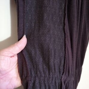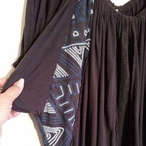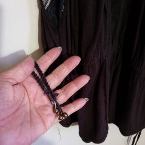 Free People draped faded black blouse with balloon sleeves and elastic neckline with drawstring peplum waistline with hanging tassels. Pretty embroidered detail and lace panel inserts. Good pre-owned condition with some signs of wear. Embroidery is loose in some areas, see pics. One of the brass tassels is missing. Oversized fit.