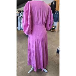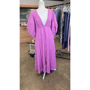 Gorgeous textured plum dress with a flattering deep V, functional front buttons, and best of all—pockets!