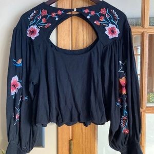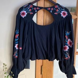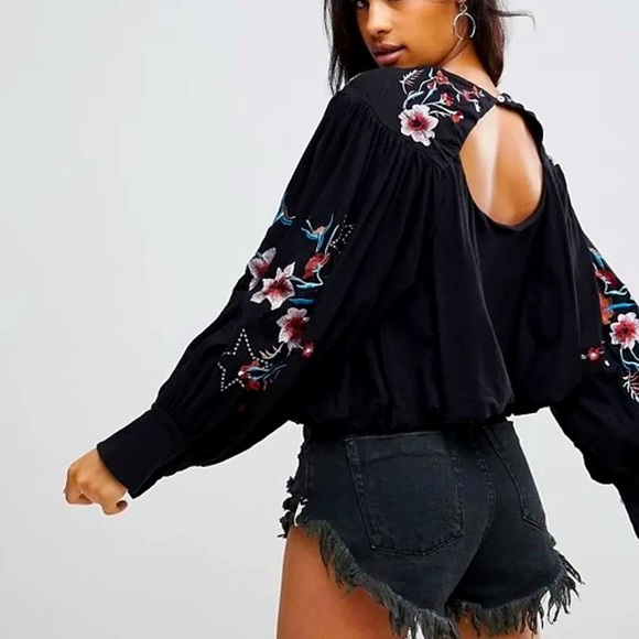 Flirty cutouts offer stylish contrast against the chic peasant details of this Free People top. Crew neckline; back button-loop closure Floral embroidery at yokes, sides and sleeves; cutout at front and back; billowed hem Long billowy sleeves; banded cuffs. Hits at hip. Cotton/linen Machine washable Imported