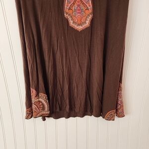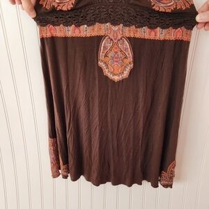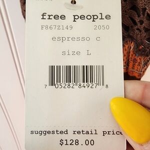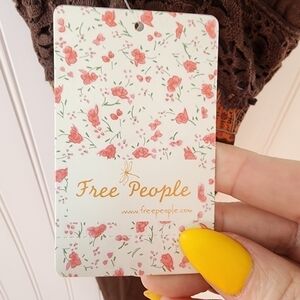 Free People espresso cotton criss cross straps w/lace trim straps, on front it has a v-neck w/ orange multi colored paisley print on breaststroke and waist and on the bottom. Cotton, cozy and adorable. NWT SIZE L
