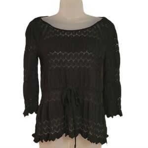 This beautiful Free People black top is pieced with sheer crochet detailing, pullover styling, rounded neckline, scalloped trim, drawstring closure at Waist with 3/4 sleeves.