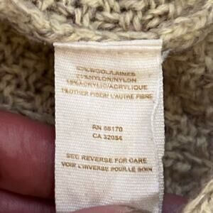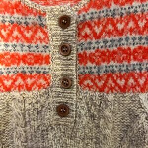 Wool blend soft babydoll style capped sleeved sweater. colors are oatmeal, orange, and brown. Four button front. Very good condition. 67% wool, 21% acrylic, 18% nylon.