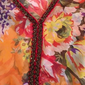 This is such a fun floral top- the fit is generous- kimono style. It's see through and blousy with pretty around the neckline and down the center. Fun bohemian top! Please feel free to ask my any questions!!