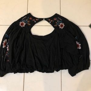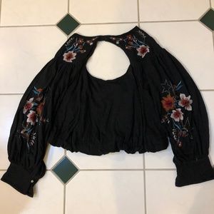 Black Free People flowy top with floral stitched details. It has an open circle high on the chest and open circle on the back. Great for summer!