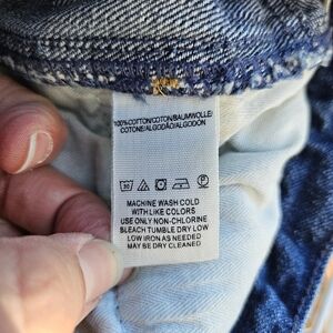 Classic denim shorts with button fly. Have a raw hem - it looks like initial hems were removed, but I don't know if this is a factory-done intentional detail or if it's something a previous owner of these shorts did. In good condition. See photos for fabric and care details.