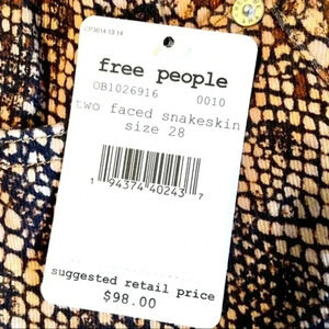 Style skinny two faced snakeskin. Sz 28. Measures 13.5” flat across waist. Rise 11” length 27”.