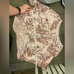 Size small. In good condition, has some discoloration in the fabric (it’s more pink in some areas), but there are no holes.