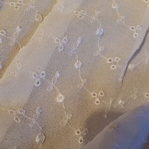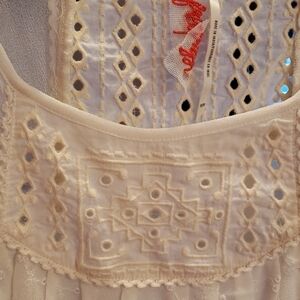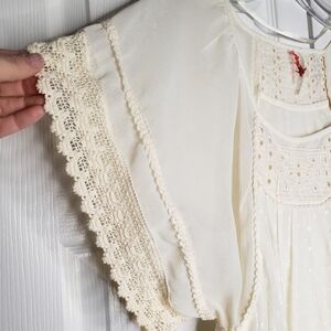 Free People lace crocheted sheer cream blouse size XS. Beautiful stitching detail. Eyelet looking lace, embroidered detail on sleeves, unique piece. Wear with a bralette or tank underneath and jeans for a night out. Very slight discoloring see last pic, might not even be noticeable when worn.