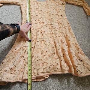 Style: Mini dress with a scoop neckline and 3/4 length sleeves. The bodice and skirt sections are lined, while the sleeves remain sheer.