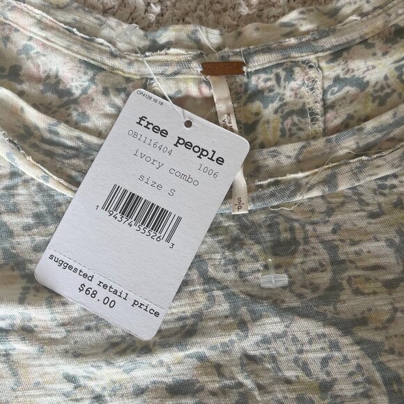 Free People light grey/pink and yellow floral printed tshirt, so soft and light weight. Not sheer, and on the back it has a pleat in the middle which adds great detail , setting it apart from just an ordinary shirt. sized as Small (oversized one size fits all). fits a large size woman.