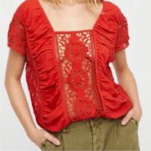 Free People Red Burnt Orange Open Crochet Paneled Cotton Gauze Boho Blouse