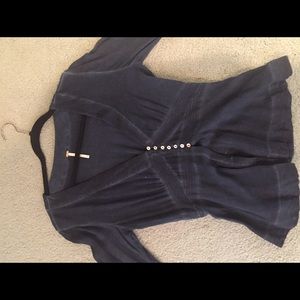 Never worn. This shirt is an elegant classic that has never been worn. Size small it's slimming as the waist area is tapered in to make it look flattering. The arms flow outward but not excessively. It also has a fairly deep V which would look great on individuals with a larger bust.