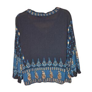womens oversized small long sleeve lyocell soft flowy fabric blouse with gold teal boho medallian print through out and bell sleeves