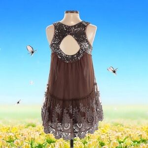 Free People mesh embroidered sheer sequin mini dress fits XS S brown party layer