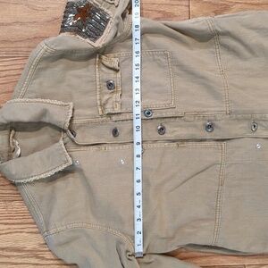 Distressed tan military-style shirt jacket with beaded eagle, Free People XS (Materials: 100% cotton, exclusive of decoration)