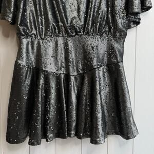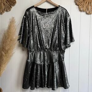 Sequin embellished, boat-neckline, relaxed short-sleeves, drop-waist detail with defined seam, flowy hem, keyhole cutout at back with a button closure, lined
