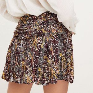Maroon abstract print ( slightly looks like snake skin )mini skirt. Size 4. No tags; however it has never been worn. True to size. Zipper.