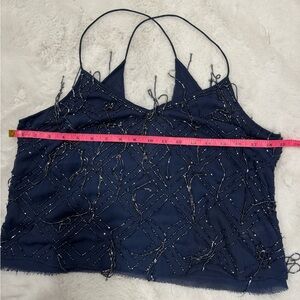 Elegant and beautiful fully-lined sheer top with silver and blue beads.