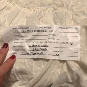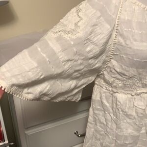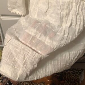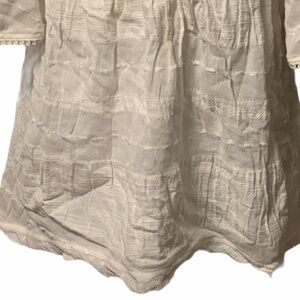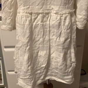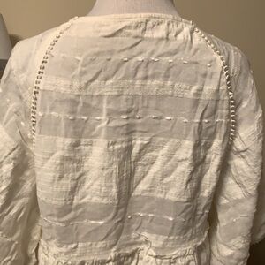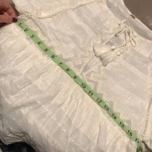 This is a pretty cool Free People top. It has a tie at the neckline that has soft tassels on it and the garment itself is made of a gauzy kind of fabric that has see-through areas so I imagine you’ll want to wear something underneath it. Embroidered areas, rough hem, so many cool features on this top. This particular piece is actually a sample piece for Free People. Size XS but please see measurements in photos. Generous sizing. Brand new, never worn.