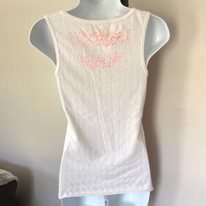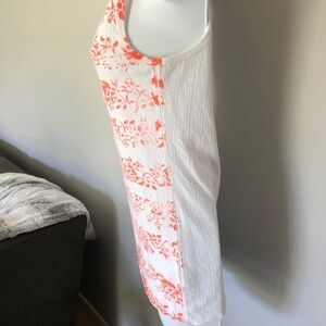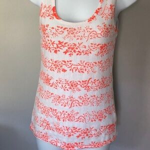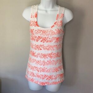 Free People orange and white tank top. Beautiful orange and white tank with floral design. Super soft textured cotton with spandex and polyester for stretch. This top is super comfortable and super cute for summer. Slight pilling. This shirt states that it is a medium, but run small so it fits like a small. Measures 15 inches across chest and 24 inches in length.
