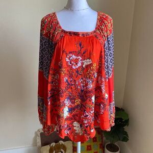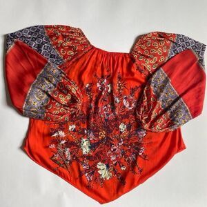 Fit & features: Could likely work for a S as well, see measurements to ensure fit. Blouse can be worn off the shoulder as well. Has a square neckline, v cut hem & a vibrant floral & paisley pattern. Shown on an XS mannequin & on a model photo I found online