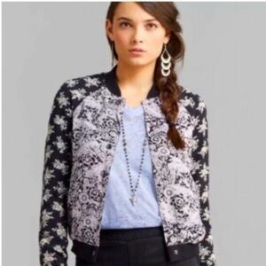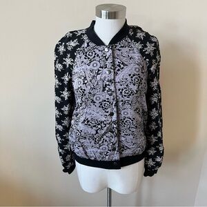 Snap front waist length lightweight bomber style jacket in a fun mixed floral pattern. Excellent condition