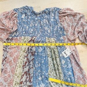 Lightweight and flowy tunic in a semi-sheer multi-color floral print with a smocked chest, ruffle neckline, pleating throughout, and keyhole back with button closure. Featured on REVOLVE.