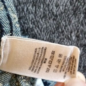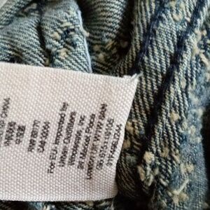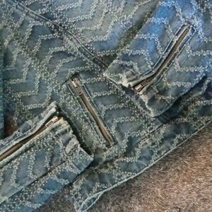 Factory faded moto style denim jacket with punched chevron pattern. Two front zip pockets and sleeve cuff zippers.