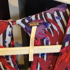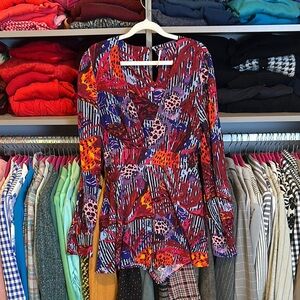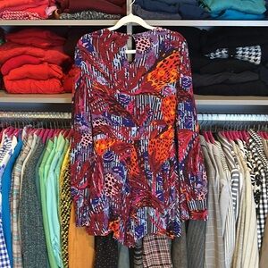 Free People red/blue print long sleeve deep v neck button back romper size 4