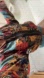 Vibrant quilted bomber with multicolor patchwork. Features a mix of patterns and a silky texture. Can wear it both ways. It is reversible originally bought it for 275. It is an oversized fit. That is why I bought it in a large. It is hand stitched so the seams are a little frayed at the bottom.