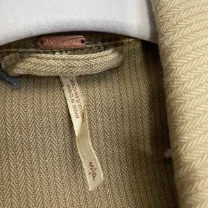 Great piece worn in photo shoot. Deliberately distressed in arm creases and pockets, bottom etc. beaded military style patch on arm.