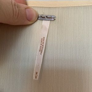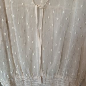 Sheer v-neck blouse with lace inserts on long sleeves. Elastic ruching at waist hem and sleeve cuffs.