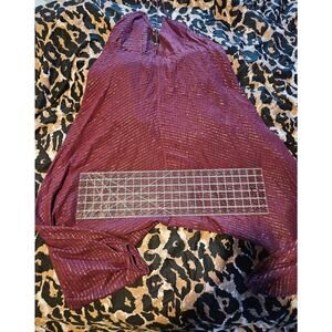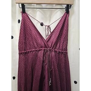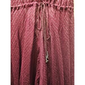 Sheer Free People maroon with shiny silver pinstripes jumpsuit size XS. Adjustable tie waist and adjustable halter ties with little bells and silver thread wrapped around ends. Very oversized and baggy in the legs and low crotch, legs taper down to ankles with elastic.