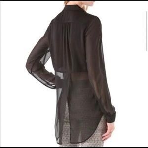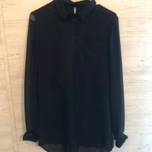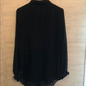 The top half is solid black and goes into a black sheer which splits in the back. The fit is an oversized style, so it can fit medium and large.