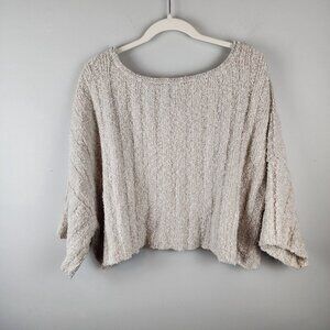 Ribbed knit, boxy silhouette, wide scoop neckline, exposed seams, wide sleeves.